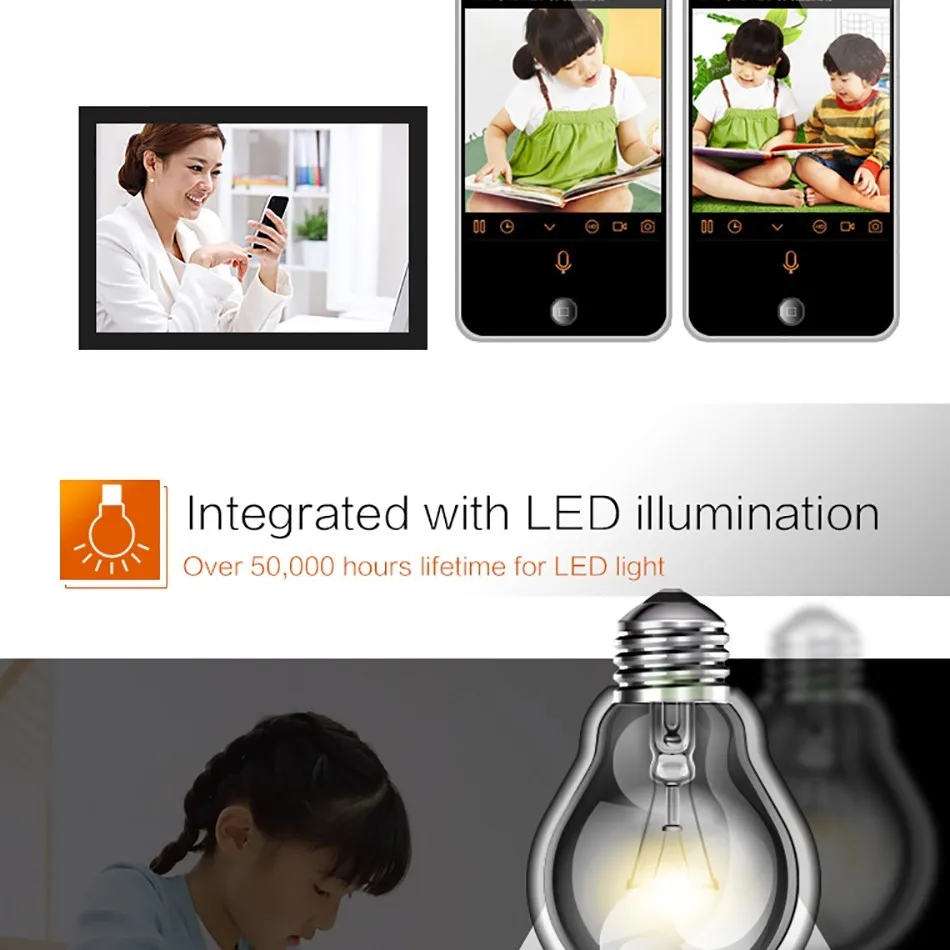 | English description | 960P 360 Degree LED Bulb Light Camera 1.28mm Fisheye Lens Motion Detection Email Alert Remote Control Wireless Connection Night Vision Specifications: H.264 HD Color CMOS Sensor, 1.3MP 1.28mm Fisheye lens, up to 360 degree view angles Support maximum 128GTF Card High image & video quality. Two-way audio P2P(Plug&Play)technology, penetration degree can be 99% LED lights allow be controlled on the app(on/off) like a lamp for lighting Mechanical IR-Cut device offers outstanding day/night performance, great color; Allow remote viewing & record from anywhere anytime Wi-Fi compliant with wireless standards IEEE 802.11b/g/n Support TCP/IP, ONVIF, RTSP, P2P SMTP, HTTP, FTP, PPPoE and other Internet related protocols; PACKAGE CONTENT 1 x IP Camera 1 x Instructions for use Newest 1.3MP 360 Degree WIFI Camera Wireless IP Camera Bulb Lamp Fisheye Panoramic Surveillance Security Camera Motion Detection