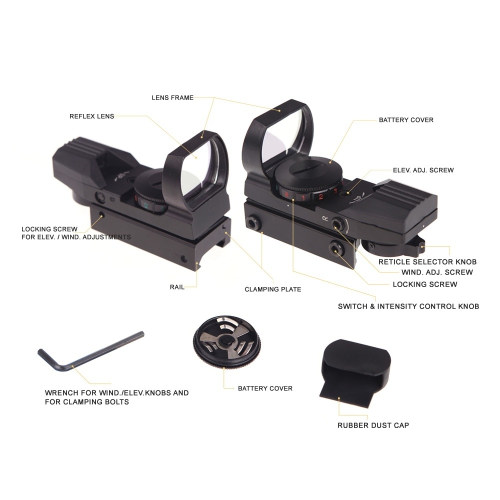 | English description | ![]() ![]() ![]() ![]() ![]() Features: Mountable to 20mm rail. Tubeless design with 33mm reflex lens aperture provides a wide field of view. Anti-glare reflective coated lens that gives good optical clarity. Constructed by aluminum alloy with anodized matte black processing. Multi-Reticle (4 patterns) or Variable Dot (4 different sizes) are installed. Parallax corrected and unlimited eye-relief. Allen head screw type windage and elevation click adjustments, with locking screw. Build-in mount (integrated rail) for standard bases, no need to rezero when remounting the dismounted sight. Very lightweight, waterproof and shockproof. Low power consumption for long battery life. Suitable for rapid-firing or shooting of moving targets besides normal shooting. Specifications: Battery: 1 * CR2032 Color: Black Material: Aluminum Alloy Lens size: 33 * 22mm / 1.30 * 0.87in Length: 82mm / 3.23in Weight: 113g / 3.99oz Package size: 11.7 * 9 * 4.7cm / 4.6 * 3.5 * 1.9in Package weight: 222g / 7.82oz |