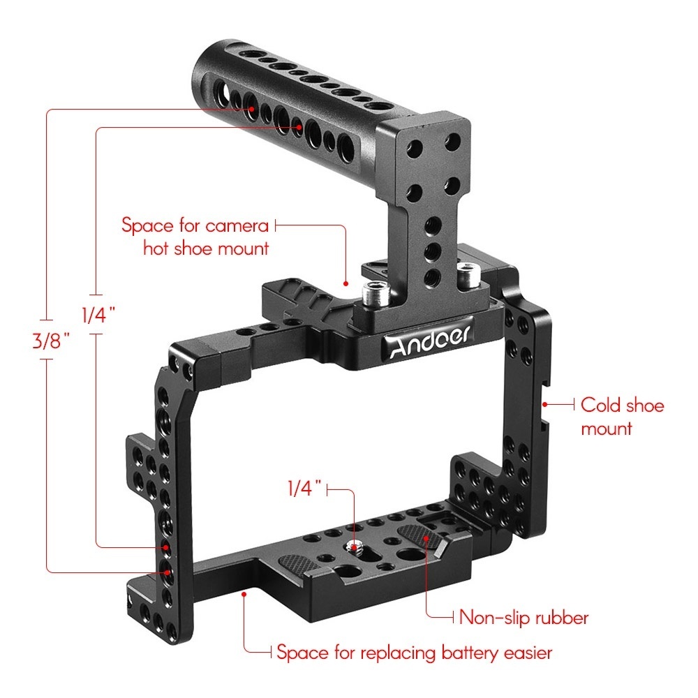 Andoer aluminum alloy camera cage is designed for Sony A7II A7RII A7SII A7S A7R A7 ILDC cameras & etc. With it, you can mount photography accessories like monitor, microphone, LED light & etc for better shooting without making any damage to your valuable camera. With both 1/4" & 3/8" screw holes everywhere. Comes with a top handle.
