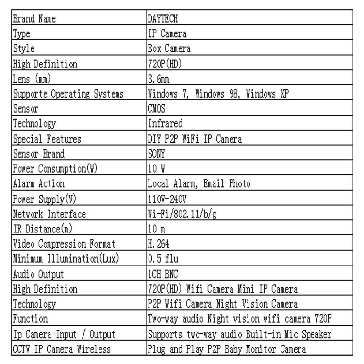 | English description | APP: Yoosee Introduction The DAYTECH ProHD 720p Wi-Fi video camera helps you stay in touch with what you love anytime, anywhere. With its quick mobile setup process, you will have secure access to your camera's video stream in no time. Stream live and playback recorded video of your home, your kids, your pets, or your business on the go with the View app. DAYTECH supportes any device including Windows PC, iPhone or Android devices. DAYTECH cameras also record to an internal MicroSD card (not included), .Each DAYTECH camera features two-way audio , night vision, remote 350 degrees pan 120 degrees tilt , smart motion alerts, email alerts and snapshots, advanced recording options, DAYTECH ProHD 720P (1MP) WiFi Security IP Camera DT-C8815C (White): Sony Image Sensor &Quick Setup / Remote Web Access from Smartphone orPC / Storage to MicroSD, Pan and Tilt / Night Vision / Two-Way Aduio / Smart Motion Alerts(you can set up the function on the app, when motions break in, IP Camera can local alarm and send the e-mail, it can be recorded if you insert a TF Card and set up. ) User Tips: The correct way to reset a IP Camera.