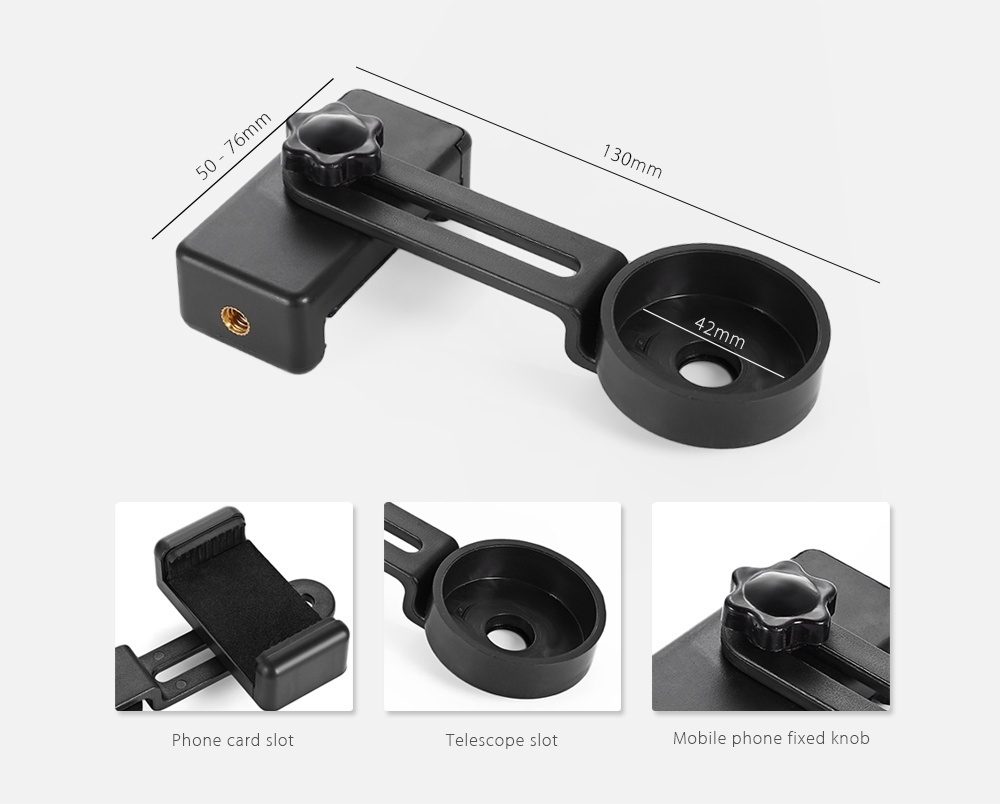 | English description | Features: - With super large width range: 50 - 76mm. Universal digiscoping adapter easily connects your any mobile phone to a wide variety of binoculars monocular and easy to capture - Compatible with telescope, binocular, monocular, night vision spotting scope. Fit eyepiece diameter 42mm - A great tool to get your mobile phone into video camera and image capture in distant and tiny world - Mobile phone interface is a fixed bracket of microscope and telescope, easy to close to the microscope eyepiece so that watch far distance scenery and take pictures - Allow you to take high-resolution snapshots of the moon, planets, constellations, and even some bright deep-space objects with this multifunctional tool. You can also connect your phone to a microscope eyepiece with this adapter, explore the nature of the micro world Use Instruction: 1. The phone clip fix the phone first and loosen the fixing screw, then fix the screw aiming to the phone camera lens 2. Cover the telescope eyepiece and press to make sure it is stable 3. After adjusting the lens clearly, you can watch the video and take the picture Note: The phones and monoculars on the picture are not included. ![]() ![]() ![]() ![]() ![]()